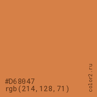 Цвет #D68047 в цветовой модели RGB обозначается тремя октетами (214, 128, 71) в десятичном формате и #D68047 в шестнадцатиричном (hex) формате, которые являются интенсивностью красного 214 (hex D6), интенсивность зелёного 128 (hex 80) и интенсивность синего 71 (hex 47).