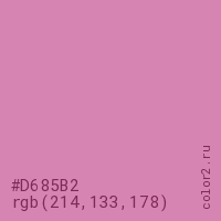 Цвет #D685B2 в цветовой модели RGB обозначается тремя октетами (214, 133, 178) в десятичном формате и #D685B2 в шестнадцатиричном (hex) формате, которые являются интенсивностью красного 214 (hex D6), интенсивность зелёного 133 (hex 85) и интенсивность синего 178 (hex B2).