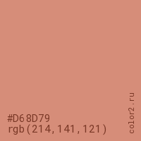 Цвет #D68D79 в цветовой модели RGB обозначается тремя октетами (214, 141, 121) в десятичном формате и #D68D79 в шестнадцатиричном (hex) формате, которые являются интенсивностью красного 214 (hex D6), интенсивность зелёного 141 (hex 8D) и интенсивность синего 121 (hex 79).