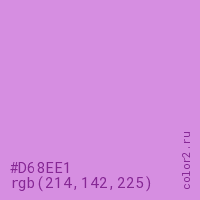 Цвет #D68EE1 в цветовой модели RGB обозначается тремя октетами (214, 142, 225) в десятичном формате и #D68EE1 в шестнадцатиричном (hex) формате, которые являются интенсивностью красного 214 (hex D6), интенсивность зелёного 142 (hex 8E) и интенсивность синего 225 (hex E1).