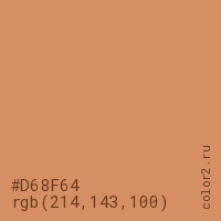 Цвет #D68F64 в цветовой модели RGB обозначается тремя октетами (214, 143, 100) в десятичном формате и #D68F64 в шестнадцатиричном (hex) формате, которые являются интенсивностью красного 214 (hex D6), интенсивность зелёного 143 (hex 8F) и интенсивность синего 100 (hex 64).
