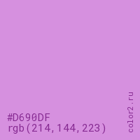 Цвет #D690DF в цветовой модели RGB обозначается тремя октетами (214, 144, 223) в десятичном формате и #D690DF в шестнадцатиричном (hex) формате, которые являются интенсивностью красного 214 (hex D6), интенсивность зелёного 144 (hex 90) и интенсивность синего 223 (hex DF).