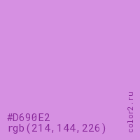 Цвет #D690E2 в цветовой модели RGB обозначается тремя октетами (214, 144, 226) в десятичном формате и #D690E2 в шестнадцатиричном (hex) формате, которые являются интенсивностью красного 214 (hex D6), интенсивность зелёного 144 (hex 90) и интенсивность синего 226 (hex E2).