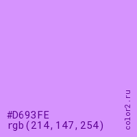Цвет #D693FE в цветовой модели RGB обозначается тремя октетами (214, 147, 254) в десятичном формате и #D693FE в шестнадцатиричном (hex) формате, которые являются интенсивностью красного 214 (hex D6), интенсивность зелёного 147 (hex 93) и интенсивность синего 254 (hex FE).
