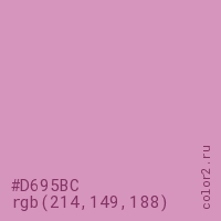 Цвет #D695BC в цветовой модели RGB обозначается тремя октетами (214, 149, 188) в десятичном формате и #D695BC в шестнадцатиричном (hex) формате, которые являются интенсивностью красного 214 (hex D6), интенсивность зелёного 149 (hex 95) и интенсивность синего 188 (hex BC).