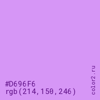 Цвет #D696F6 в цветовой модели RGB обозначается тремя октетами (214, 150, 246) в десятичном формате и #D696F6 в шестнадцатиричном (hex) формате, которые являются интенсивностью красного 214 (hex D6), интенсивность зелёного 150 (hex 96) и интенсивность синего 246 (hex F6).
