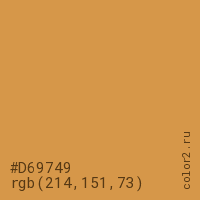 Цвет #D69749 в цветовой модели RGB обозначается тремя октетами (214, 151, 73) в десятичном формате и #D69749 в шестнадцатиричном (hex) формате, которые являются интенсивностью красного 214 (hex D6), интенсивность зелёного 151 (hex 97) и интенсивность синего 73 (hex 49).