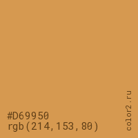 Цвет #D69950 в цветовой модели RGB обозначается тремя октетами (214, 153, 80) в десятичном формате и #D69950 в шестнадцатиричном (hex) формате, которые являются интенсивностью красного 214 (hex D6), интенсивность зелёного 153 (hex 99) и интенсивность синего 80 (hex 50).