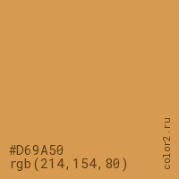 Цвет #D69A50 в цветовой модели RGB обозначается тремя октетами (214, 154, 80) в десятичном формате и #D69A50 в шестнадцатиричном (hex) формате, которые являются интенсивностью красного 214 (hex D6), интенсивность зелёного 154 (hex 9A) и интенсивность синего 80 (hex 50).