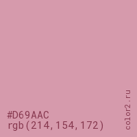 Цвет #D69AAC в цветовой модели RGB обозначается тремя октетами (214, 154, 172) в десятичном формате и #D69AAC в шестнадцатиричном (hex) формате, которые являются интенсивностью красного 214 (hex D6), интенсивность зелёного 154 (hex 9A) и интенсивность синего 172 (hex AC).