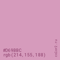 Цвет #D69BBC в цветовой модели RGB обозначается тремя октетами (214, 155, 188) в десятичном формате и #D69BBC в шестнадцатиричном (hex) формате, которые являются интенсивностью красного 214 (hex D6), интенсивность зелёного 155 (hex 9B) и интенсивность синего 188 (hex BC).