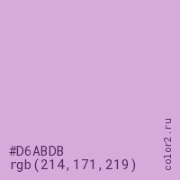 Цвет #D6ABDB в цветовой модели RGB обозначается тремя октетами (214, 171, 219) в десятичном формате и #D6ABDB в шестнадцатиричном (hex) формате, которые являются интенсивностью красного 214 (hex D6), интенсивность зелёного 171 (hex AB) и интенсивность синего 219 (hex DB).