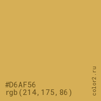 Цвет #D6AF56 в цветовой модели RGB обозначается тремя октетами (214, 175, 86) в десятичном формате и #D6AF56 в шестнадцатиричном (hex) формате, которые являются интенсивностью красного 214 (hex D6), интенсивность зелёного 175 (hex AF) и интенсивность синего 86 (hex 56).