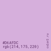 Цвет #D6AFDC в цветовой модели RGB обозначается тремя октетами (214, 175, 220) в десятичном формате и #D6AFDC в шестнадцатиричном (hex) формате, которые являются интенсивностью красного 214 (hex D6), интенсивность зелёного 175 (hex AF) и интенсивность синего 220 (hex DC).