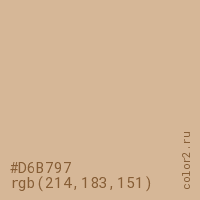 Цвет #D6B797 в цветовой модели RGB обозначается тремя октетами (214, 183, 151) в десятичном формате и #D6B797 в шестнадцатиричном (hex) формате, которые являются интенсивностью красного 214 (hex D6), интенсивность зелёного 183 (hex B7) и интенсивность синего 151 (hex 97).
