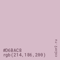 Цвет #D6BAC8 в цветовой модели RGB обозначается тремя октетами (214, 186, 200) в десятичном формате и #D6BAC8 в шестнадцатиричном (hex) формате, которые являются интенсивностью красного 214 (hex D6), интенсивность зелёного 186 (hex BA) и интенсивность синего 200 (hex C8).