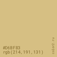 Цвет #D6BF83 в цветовой модели RGB обозначается тремя октетами (214, 191, 131) в десятичном формате и #D6BF83 в шестнадцатиричном (hex) формате, которые являются интенсивностью красного 214 (hex D6), интенсивность зелёного 191 (hex BF) и интенсивность синего 131 (hex 83).