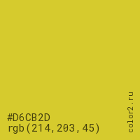 Цвет #D6CB2D в цветовой модели RGB обозначается тремя октетами (214, 203, 45) в десятичном формате и #D6CB2D в шестнадцатиричном (hex) формате, которые являются интенсивностью красного 214 (hex D6), интенсивность зелёного 203 (hex CB) и интенсивность синего 45 (hex 2D).