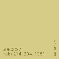 Цвет #D6CC87 в цветовой модели RGB обозначается тремя октетами (214, 204, 135) в десятичном формате и #D6CC87 в шестнадцатиричном (hex) формате, которые являются интенсивностью красного 214 (hex D6), интенсивность зелёного 204 (hex CC) и интенсивность синего 135 (hex 87).