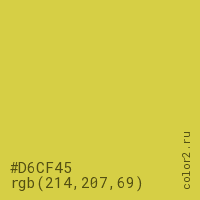 Цвет #D6CF45 в цветовой модели RGB обозначается тремя октетами (214, 207, 69) в десятичном формате и #D6CF45 в шестнадцатиричном (hex) формате, которые являются интенсивностью красного 214 (hex D6), интенсивность зелёного 207 (hex CF) и интенсивность синего 69 (hex 45).