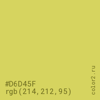 Цвет #D6D45F в цветовой модели RGB обозначается тремя октетами (214, 212, 95) в десятичном формате и #D6D45F в шестнадцатиричном (hex) формате, которые являются интенсивностью красного 214 (hex D6), интенсивность зелёного 212 (hex D4) и интенсивность синего 95 (hex 5F).