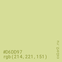 Цвет #D6DD97 в цветовой модели RGB обозначается тремя октетами (214, 221, 151) в десятичном формате и #D6DD97 в шестнадцатиричном (hex) формате, которые являются интенсивностью красного 214 (hex D6), интенсивность зелёного 221 (hex DD) и интенсивность синего 151 (hex 97).