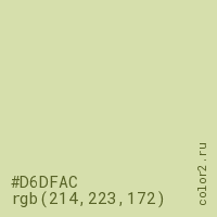 Цвет #D6DFAC в цветовой модели RGB обозначается тремя октетами (214, 223, 172) в десятичном формате и #D6DFAC в шестнадцатиричном (hex) формате, которые являются интенсивностью красного 214 (hex D6), интенсивность зелёного 223 (hex DF) и интенсивность синего 172 (hex AC).