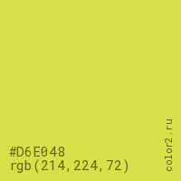 Цвет #D6E048 в цветовой модели RGB обозначается тремя октетами (214, 224, 72) в десятичном формате и #D6E048 в шестнадцатиричном (hex) формате, которые являются интенсивностью красного 214 (hex D6), интенсивность зелёного 224 (hex E0) и интенсивность синего 72 (hex 48).