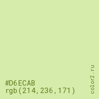 Цвет #D6ECAB в цветовой модели RGB обозначается тремя октетами (214, 236, 171) в десятичном формате и #D6ECAB в шестнадцатиричном (hex) формате, которые являются интенсивностью красного 214 (hex D6), интенсивность зелёного 236 (hex EC) и интенсивность синего 171 (hex AB).