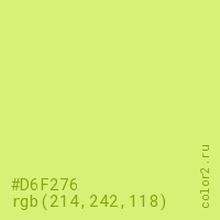 Цвет #D6F276 в цветовой модели RGB обозначается тремя октетами (214, 242, 118) в десятичном формате и #D6F276 в шестнадцатиричном (hex) формате, которые являются интенсивностью красного 214 (hex D6), интенсивность зелёного 242 (hex F2) и интенсивность синего 118 (hex 76).