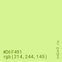 Цвет #D6F491 в цветовой модели RGB обозначается тремя октетами (214, 244, 145) в десятичном формате и #D6F491 в шестнадцатиричном (hex) формате, которые являются интенсивностью красного 214 (hex D6), интенсивность зелёного 244 (hex F4) и интенсивность синего 145 (hex 91).