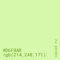 Цвет #D6F8AB в цветовой модели RGB обозначается тремя октетами (214, 248, 171) в десятичном формате и #D6F8AB в шестнадцатиричном (hex) формате, которые являются интенсивностью красного 214 (hex D6), интенсивность зелёного 248 (hex F8) и интенсивность синего 171 (hex AB).