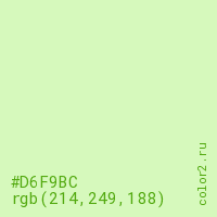Цвет #D6F9BC в цветовой модели RGB обозначается тремя октетами (214, 249, 188) в десятичном формате и #D6F9BC в шестнадцатиричном (hex) формате, которые являются интенсивностью красного 214 (hex D6), интенсивность зелёного 249 (hex F9) и интенсивность синего 188 (hex BC).