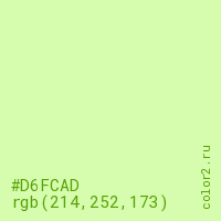 Цвет #D6FCAD в цветовой модели RGB обозначается тремя октетами (214, 252, 173) в десятичном формате и #D6FCAD в шестнадцатиричном (hex) формате, которые являются интенсивностью красного 214 (hex D6), интенсивность зелёного 252 (hex FC) и интенсивность синего 173 (hex AD).
