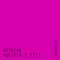 Цвет #D701AB в цветовой модели RGB обозначается тремя октетами (215, 1, 171) в десятичном формате и #D701AB в шестнадцатиричном (hex) формате, которые являются интенсивностью красного 215 (hex D7), интенсивность зелёного 1 (hex 01) и интенсивность синего 171 (hex AB).