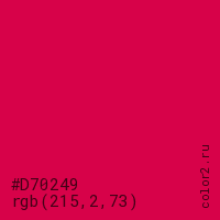 Цвет #D70249 в цветовой модели RGB обозначается тремя октетами (215, 2, 73) в десятичном формате и #D70249 в шестнадцатиричном (hex) формате, которые являются интенсивностью красного 215 (hex D7), интенсивность зелёного 2 (hex 02) и интенсивность синего 73 (hex 49).