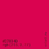 Цвет #D7034D в цветовой модели RGB обозначается тремя октетами (215, 3, 77) в десятичном формате и #D7034D в шестнадцатиричном (hex) формате, которые являются интенсивностью красного 215 (hex D7), интенсивность зелёного 3 (hex 03) и интенсивность синего 77 (hex 4D).