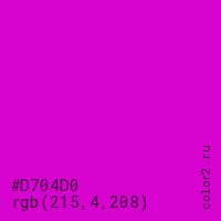 Цвет #D704D0 в цветовой модели RGB обозначается тремя октетами (215, 4, 208) в десятичном формате и #D704D0 в шестнадцатиричном (hex) формате, которые являются интенсивностью красного 215 (hex D7), интенсивность зелёного 4 (hex 04) и интенсивность синего 208 (hex D0).