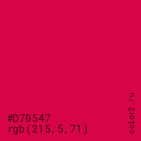 Цвет #D70547 в цветовой модели RGB обозначается тремя октетами (215, 5, 71) в десятичном формате и #D70547 в шестнадцатиричном (hex) формате, которые являются интенсивностью красного 215 (hex D7), интенсивность зелёного 5 (hex 05) и интенсивность синего 71 (hex 47).