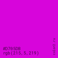 Цвет #D705DB в цветовой модели RGB обозначается тремя октетами (215, 5, 219) в десятичном формате и #D705DB в шестнадцатиричном (hex) формате, которые являются интенсивностью красного 215 (hex D7), интенсивность зелёного 5 (hex 05) и интенсивность синего 219 (hex DB).