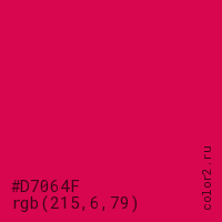 Цвет #D7064F в цветовой модели RGB обозначается тремя октетами (215, 6, 79) в десятичном формате и #D7064F в шестнадцатиричном (hex) формате, которые являются интенсивностью красного 215 (hex D7), интенсивность зелёного 6 (hex 06) и интенсивность синего 79 (hex 4F).