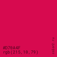 Цвет #D70A4F в цветовой модели RGB обозначается тремя октетами (215, 10, 79) в десятичном формате и #D70A4F в шестнадцатиричном (hex) формате, которые являются интенсивностью красного 215 (hex D7), интенсивность зелёного 10 (hex 0A) и интенсивность синего 79 (hex 4F).