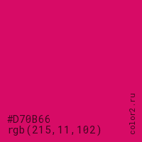 Цвет #D70B66 в цветовой модели RGB обозначается тремя октетами (215, 11, 102) в десятичном формате и #D70B66 в шестнадцатиричном (hex) формате, которые являются интенсивностью красного 215 (hex D7), интенсивность зелёного 11 (hex 0B) и интенсивность синего 102 (hex 66).