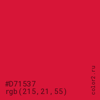 Цвет #D71537 в цветовой модели RGB обозначается тремя октетами (215, 21, 55) в десятичном формате и #D71537 в шестнадцатиричном (hex) формате, которые являются интенсивностью красного 215 (hex D7), интенсивность зелёного 21 (hex 15) и интенсивность синего 55 (hex 37).