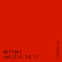 Цвет #D71801 в цветовой модели RGB обозначается тремя октетами (215, 24, 1) в десятичном формате и #D71801 в шестнадцатиричном (hex) формате, которые являются интенсивностью красного 215 (hex D7), интенсивность зелёного 24 (hex 18) и интенсивность синего 1 (hex 01).