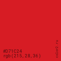 Цвет #D71C24 в цветовой модели RGB обозначается тремя октетами (215, 28, 36) в десятичном формате и #D71C24 в шестнадцатиричном (hex) формате, которые являются интенсивностью красного 215 (hex D7), интенсивность зелёного 28 (hex 1C) и интенсивность синего 36 (hex 24).