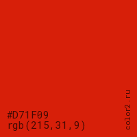 Цвет #D71F09 в цветовой модели RGB обозначается тремя октетами (215, 31, 9) в десятичном формате и #D71F09 в шестнадцатиричном (hex) формате, которые являются интенсивностью красного 215 (hex D7), интенсивность зелёного 31 (hex 1F) и интенсивность синего 9 (hex 09).