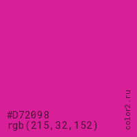 Цвет #D72098 в цветовой модели RGB обозначается тремя октетами (215, 32, 152) в десятичном формате и #D72098 в шестнадцатиричном (hex) формате, которые являются интенсивностью красного 215 (hex D7), интенсивность зелёного 32 (hex 20) и интенсивность синего 152 (hex 98).