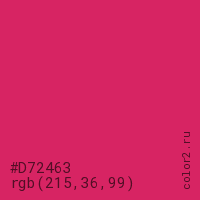 Цвет #D72463 в цветовой модели RGB обозначается тремя октетами (215, 36, 99) в десятичном формате и #D72463 в шестнадцатиричном (hex) формате, которые являются интенсивностью красного 215 (hex D7), интенсивность зелёного 36 (hex 24) и интенсивность синего 99 (hex 63).