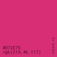 Цвет #D72E75 в цветовой модели RGB обозначается тремя октетами (215, 46, 117) в десятичном формате и #D72E75 в шестнадцатиричном (hex) формате, которые являются интенсивностью красного 215 (hex D7), интенсивность зелёного 46 (hex 2E) и интенсивность синего 117 (hex 75).